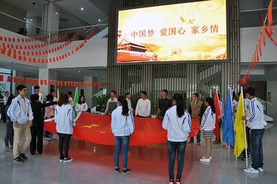 上午11点整,在庄严的国歌声中,鲜艳的五星红旗徐徐展开,十余名展旗手随着国歌节奏拉动国旗,周边数名学生挥动彩旗,手持“祖国生日快乐”标语,参加展旗仪式的所有人员高唱国歌,表达了对祖国母亲生日的亲切问候和衷心的祝福。