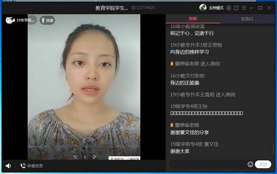 活动共有两项内容:支部书记董婷瑜带领支部全体成员回顾党的光辉历史,并对学生党员应有的精神风貌做出强调,坚定理想信念,要牢记肩上责任,践行初心使命,争当党员先锋模范;学生党员以录制视频的方式分享政治理论学习心得、疫情期间志愿服务心得以及网课学习期间如何充实安排学习和生活。